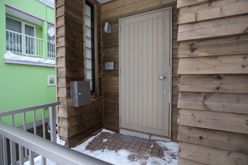 - 2026-02-07 ヨキヌケノイエ 外観2:カラマツの外壁とノルドの木製ドアのコンビネーション。