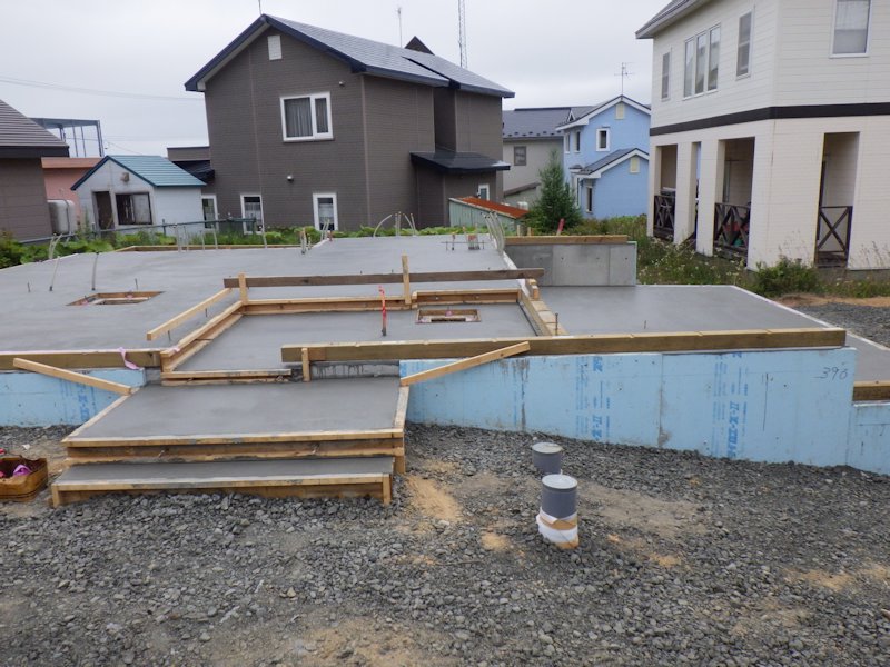 - 2021-07-27 Lalala・noie 心配していた雨も降らず、基礎工事最後のコンクリート打設が完了しました。スキップフロアーの段差が良く分かります。