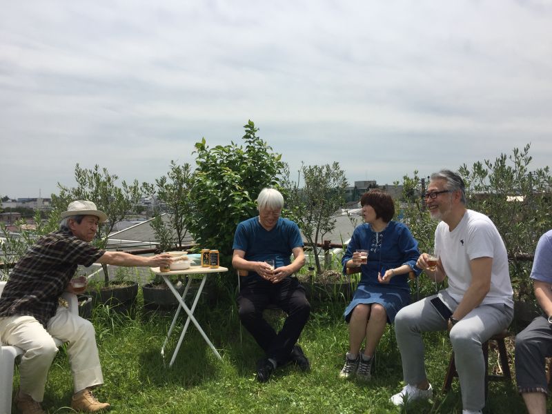 - 2016-07-05 室伏次郎自邸 屋上 2・3各階へは外部階段、4階へは内部階段。その他に仮設足場の階段で各階にアプローチします。その階段は屋上へ続き眺めの良い庭園で室伏さんを囲み皆で午前中からビール。中央に居るのは今回の「押し掛け宴会」の団長、北海道を代表する尊敬する建築家、圓山さん。