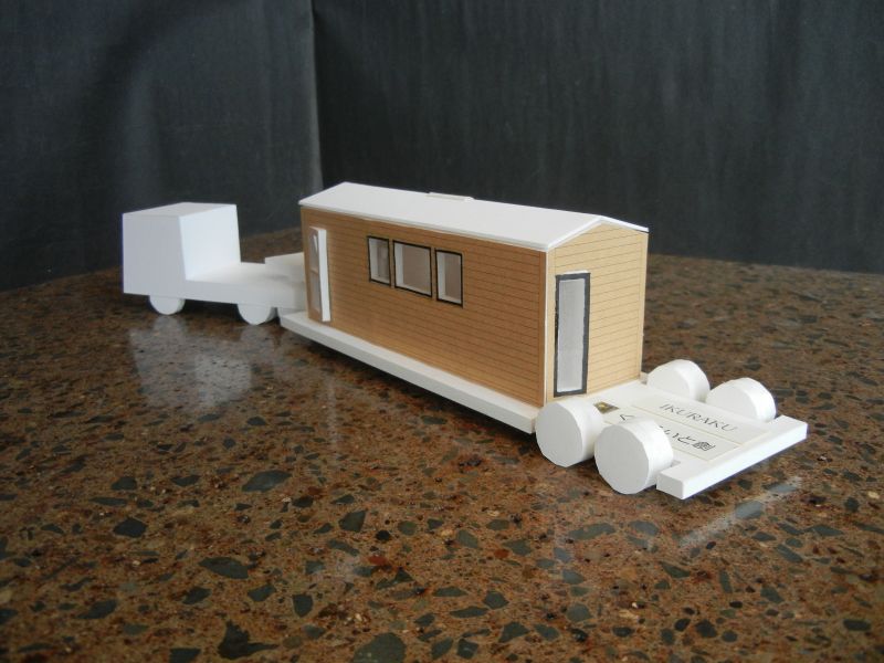 設計主旨:トレーラーハウスのデザインがきっかけとなったプロジェクトである。販売されているトレーラーハウスを使い移動式診療所を考えていたクライアントが御相談に来てスタートした。デザインを始めるに当たりメーカーとのやり取りの中で日本でのトレーラーハウス販売は、移動してというよりも建築物とならない点が固定資産税等の税法上のメリットとなる事が売りで車検を取るケースは稀な事、車検を取る場合は別途費用が掛かり予算をはるかに超える事がわかり、トレーラーに乗せて建物ごと引越しできる建築を創る事になった。間口2.25m長さ7.735mの細長い建築は束石という基礎に乗せて建築される。