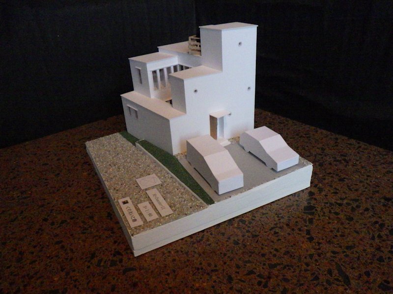 設計主旨:市内の歴史のある地域に計画した家族4人の住宅である。敷地は3差路の交差点に面していて横断歩道で囲まれたトリッキーな位置なあり準防火地域でもある。敷地へのアプローチが少しでも楽になるように事前に警察署へ行き交差点内の縁石の切下げや進入方法を相談してスタートした。敷地に倣った台形の平面計画はクライアントの一番の要望である中庭を囲むコートハウスとした。準防火地域で外部の窓は防火戸を要求されるがコートで囲われた部分は要求されないため有利な計画でもある。道路に面したファサードはエントランスのドアと小さな丸い窓のみ、各室の採光はコートに面した開口部から確保する計画とした。エントランスからは土間を介してLDKと水回りの2方向にアプローチ出来る回遊できるプランである。リビングから上えつながる階段は鉄骨の片持ち階段として空間のアクセントとなっている。ダイニングテーブルと一体の変形コの字型の製作キッチン。中二階の個室。階数に算入されない3階のペントハウス。ペントハウスからは屋根に出られるウッドデッキを設けた。高台にある敷地を活用しクライアントの要望で釧路の花火大会をこのデッキから楽しむ。たくさんのクライアントの夢を詰め込んだ「イイトコドリ」の住宅である。また一つとても完成が楽しみな建築がスタートする。